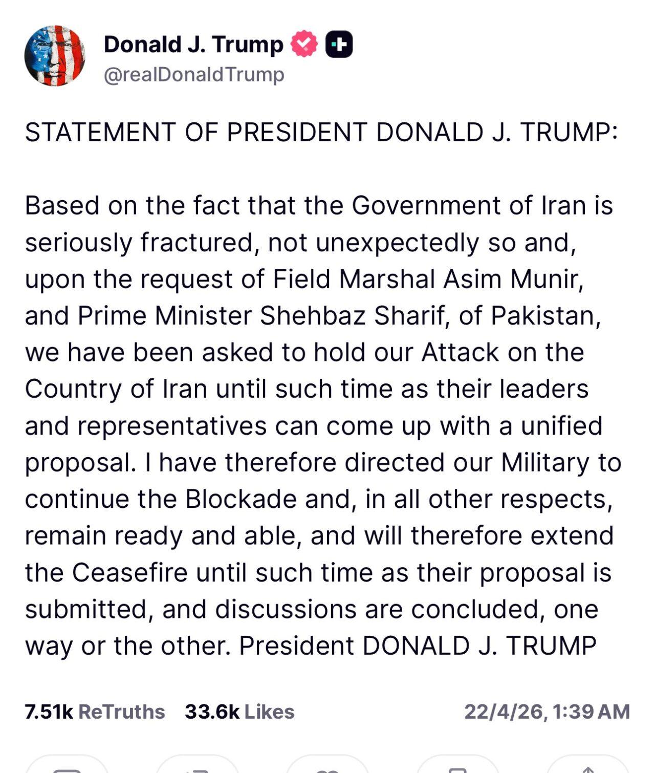“इस बात के आधार पर कि ईरान की सरकार बुरी तरह से बँटी हुई है, जो अचानक नहीं हुआ और, फील्ड मार्शल असीम मुनीर और पाकिस्तान के प्राइम मिनिस्टर शहबाज शरीफ़ के कहने पर, हमसे कहा गया है कि हम ईरान देश पर अपना हमला तब तक रोक दें जब तक उनके लीडर और रिप्रेजेंटेटिव एक साथ कोई प्रपोज़ल नहीं ला देते। इसलिए मैंने अपनी मिलिट्री को ब्लॉकेड जारी रखने और बाकी सभी मामलों में तैयार और काबिल रहने का निर्देश दिया है, और इसलिए सीज़फ़ायर को तब तक बढ़ाएंगे जब तक उनका प्रपोज़ल जमा नहीं हो जाता, और बातचीत किसी न किसी तरह खत्म नहीं हो जाती।