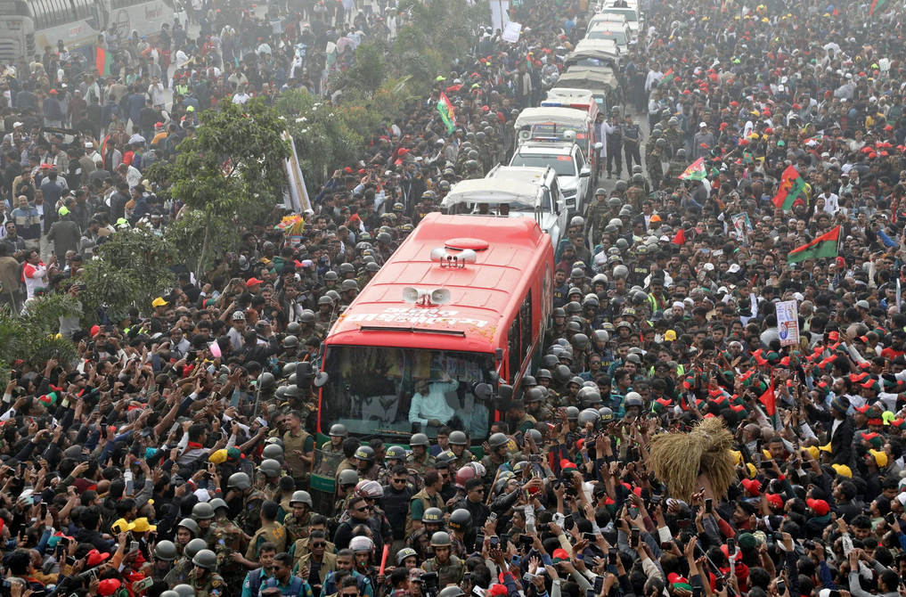 बांग्लादेश नेशनलिस्ट पार्टी (BNP) के कार्यकारी अध्यक्ष और पूर्व प्रधानमंत्री खालिदा ज़िया के बेटे तारिक रहमान लगभग 17 साल के लंदन में निर्वासन के बाद ढाका लौट आए हैं। वह अपनी पत्नी और बेटी के साथ हज़रत शाहजलाल अंतर्राष्ट्रीय हवाई अड्डे पर पहुँचे, जहाँ समर्थकों की भारी भीड़ ने उनका स्वागत किया।