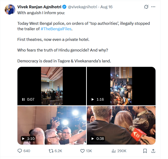16 अगस्त, 2025 को कोलकाता में *द बंगाल फाइल्स* के ट्रेलर लॉन्च में हंगामा हुआ, जिससे विवाद छिड़ गया। निर्देशक विवेक अग्निहोत्री ने पश्चिम बंगाल सरकार पर “तानाशाही” का आरोप लगाया